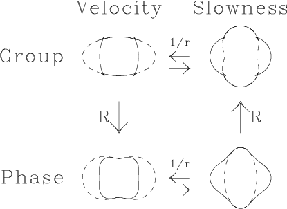 Figure 1. Group velocity (= impulse response), group slowness, phase velocity, and phase slowness (= dispersion relation) plots for the qSV mode of Greenhorn Shale (thick solid line) and an elliptically anisotropic paraxial approximation to it (thin dashed line). The `` ![]() ![]() |