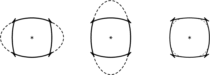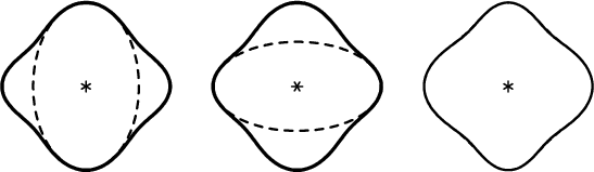 Figure 2. Three different approximations (dashed curves) to the qSV impulse-response surface of Greenhorn Shale (bold curves). On the left is the standard vertical paraxial elliptic approximation. In the center is the horizontal paraxial elliptic approximation. On the right is Muir's double-elliptic approximation. |
