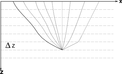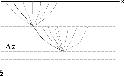 Figure 6. Propagation paths from the surface to a depth point for layer-stripping Kirchhoff downward continuation. |