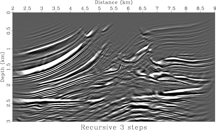 In Figure 10, I compare the images in the vicinity of the target zone to the velocity model and a filtered reflectivity model which represents the desired image. Both images compare favorably to the desired reflectivity. The image obtained by downward continuing the data in three steps of 500 m is superior since the events display better lateral continuity and the image is clearer. This is because the traveltimes calculated for each of the 500 m steps are simpler and better behaved than the traveltimes calculated for one step of 1500 m.
