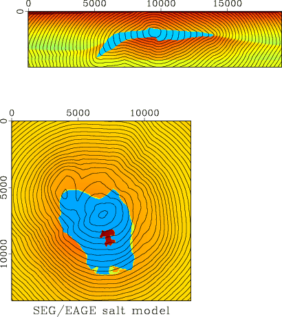 Figure 1. Constant-traveltime contours of the first-arrival traveltime, computed in the SEG/EAGE salt model. A point source is positioned inside the salt body. The top plot is a diagonal slice; the bottom plot, a depth slice. |