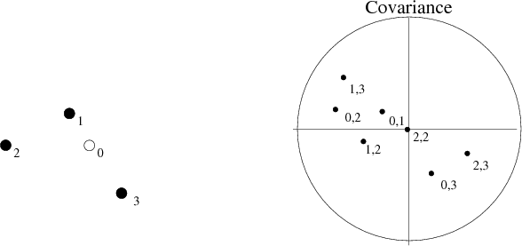 Figure 4. Definition of the terms in equation (3). A vector is drawn between two points. The covariance at the angle and distance describing the vector is then selected. |