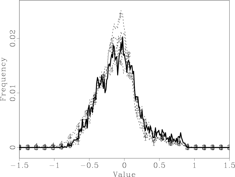 Figure 6. Histogram of the known data (solid line) and the four different realizations of Figure 5. |