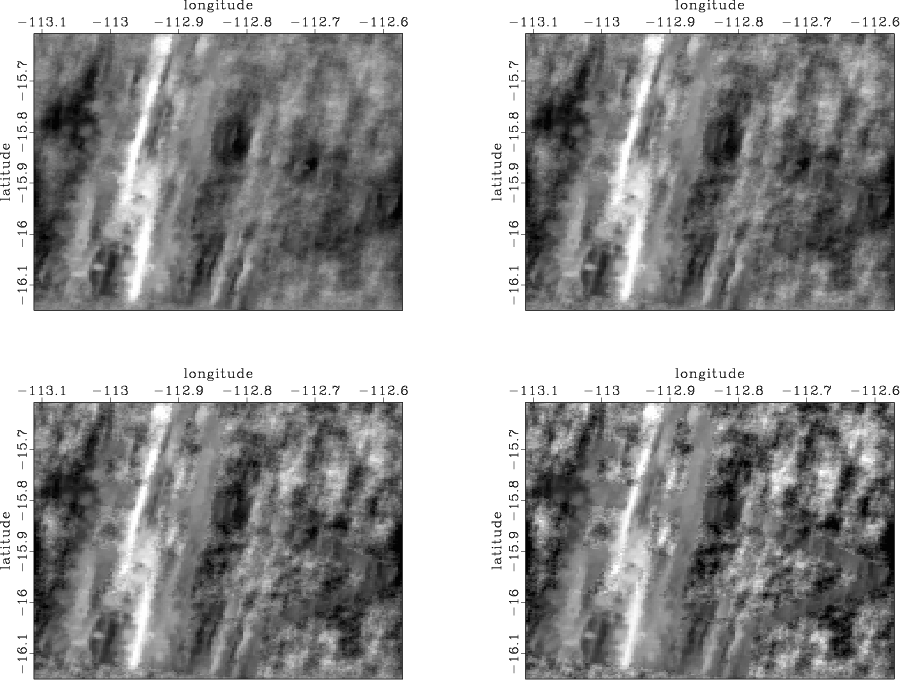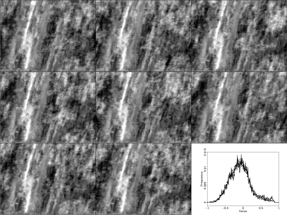 Figure 7 shows eight different realizations with a random noise level calculated through equation (8). Note how we have done a good job emulating the distribution of the known data. Each image shows some similar features but also significant differences (especially note within the `V' portion of the known data).