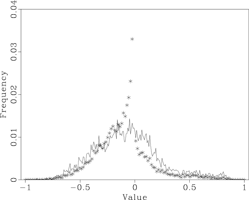 Figure 3. Histogram for the known data (solid lines) and the estimated data (`*'). Note the dissimilar shapes. |