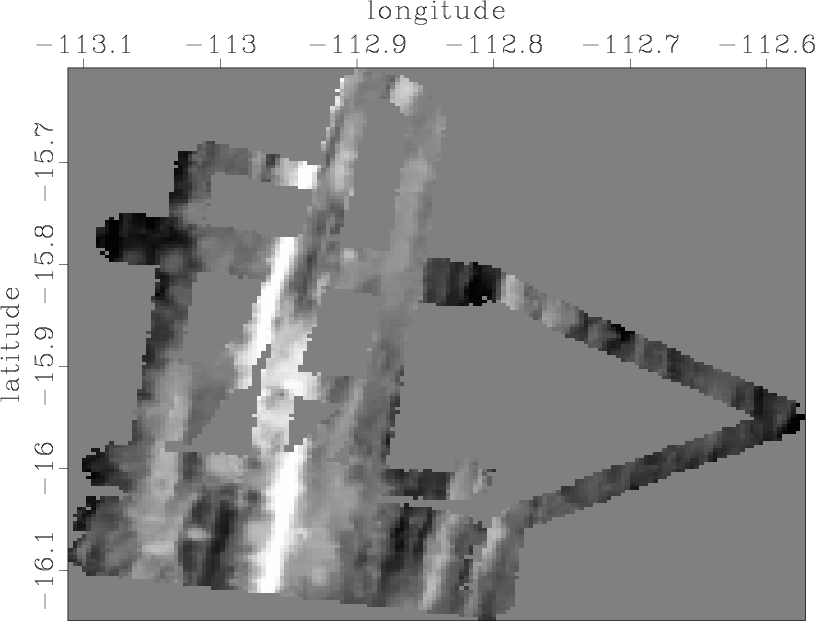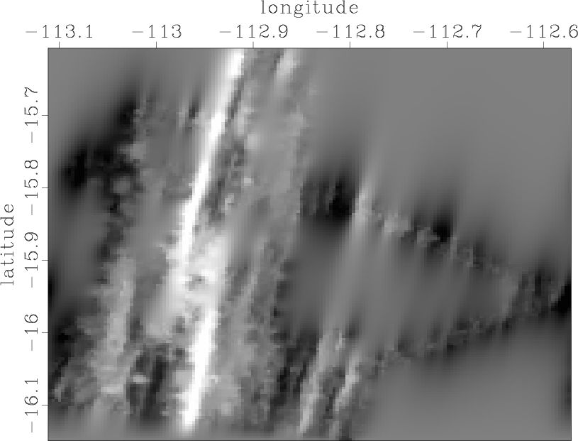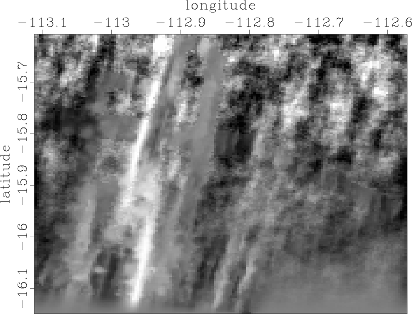 Figure 2 shows the result of estimating a PEF from the known data locations and then using it to interpolate the entire mesh. Note how the solution has a lower spatial frequency as we move away from the recorded data. In addition, the original tracks of the ship are still clearly visible.