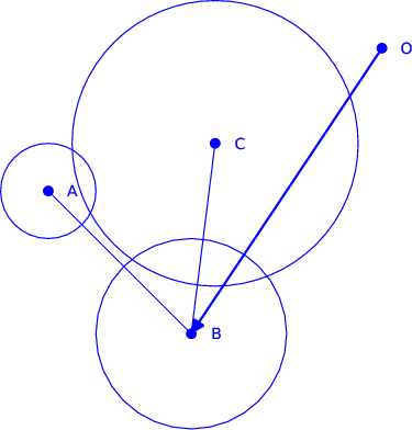 Figure 4. Cusp points. A, B and C are the three points on the current wavefront. Point O is the previous point on the ray going through B. The angle CBA is smaller than the angle OBA, and therefore B is a cusp point. If the angle CBA is closer to 90 degrees than the angle OBA, then C is merged with B; otherwise, A is merged with B. The three-point scheme becomes a two-point scheme without any change in the program. |