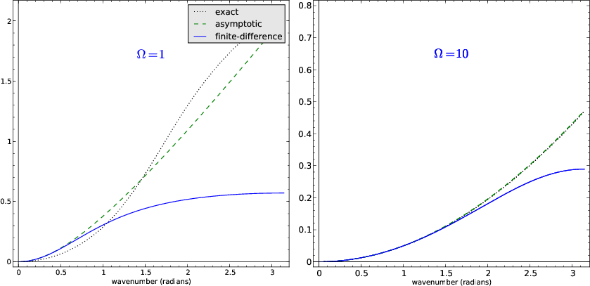 Figure 1. Phase of the implicit offset-continuation operators in comparison with the exact solution. The offset increment is assumed to be equal to the midpoint spacing. The left plot corresponds to ![]() ![]() |