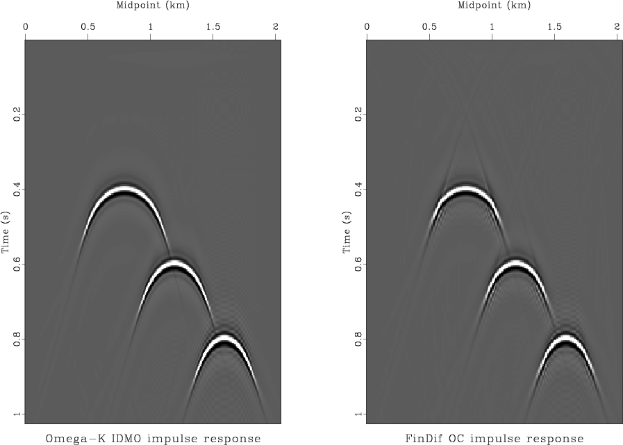 Figure 2. Inverse DMO impulse responses computed by the Fourier method (left) and by finite-difference offset continuation (right). The offset is 1 km. |