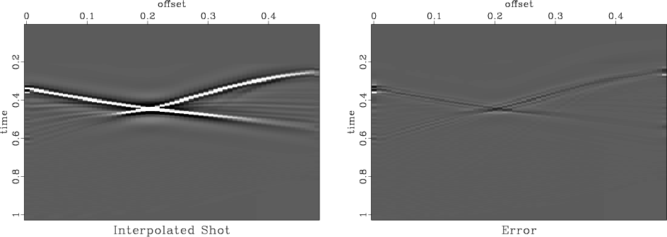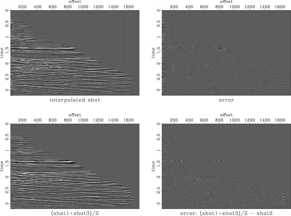 Figure 9 shows the result of a shot interpolation experiment using the constant-velocity synthetic from Figure 4. In this experiment, I removed one of the shot gathers from the original NMO-corrected data and interpolated it back using equation (17). Subtracting the true shot gather from the reconstructed one shows a very insignificant error, which is further reduced by using the PEF regularization (right plots in Figure 9). The two neighboring shot gathers used in this experiment are shown in the top plots of Figure 8. For comparison, the bottom plots in Figure 8 show the simple average of the two shot gathers and its corresponding prediction error. As expected, the error is significantly larger than the error of shot continuation. An interpolation scheme based on local dips in the shot direction would probably achieve a better result, but it is significantly more expensive than the shot continuation scheme introduced above.