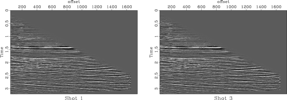 Figure 10. Two real marine shot gathers used for the shot interpolation experiment. An NMO correction has been applied. |