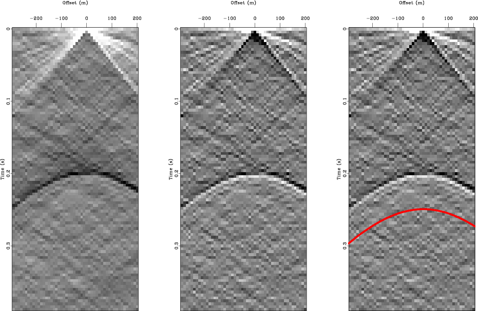 Figure 3. Pseudo-shot gather over model with single horizontal layer and 200 incoming plane waves. The left panel is raw cross-correlations, the center panel has a half differentiation filter applied and the right panel is labeled with the correct kinematics shifted by 0.05 s. |