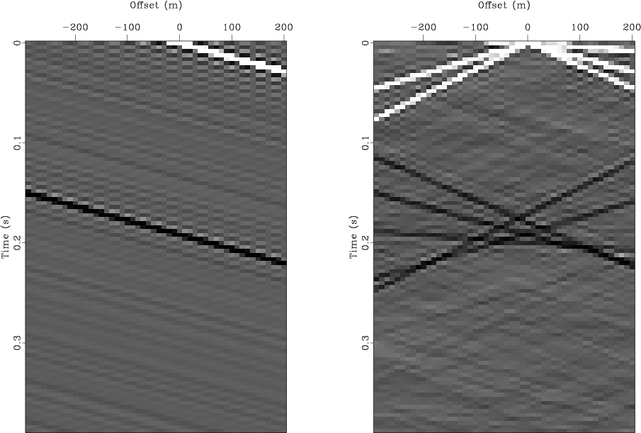 Figure 4 shows how the hyperbolas build up from the individual plane waves. In the left panel there is only one plane wave present, instead of 200 as in Figure 3. The trace at zero spatial offset is the autocorrelation function, and it has two spike as expected: one at zero lag and one corresponding to the reflected event. Other traces, corresponding to cross-correlations, have the two same spikes, but these are offset in time due to the different receiver positions and the apparent velocity of the incident wave. In the right panel of Figure 4 there are 5 plane waves incident, and a hyperbola is beginning to form. Only one part of each plane wave adds coherently with the others, the rest of the energy is smeared out.