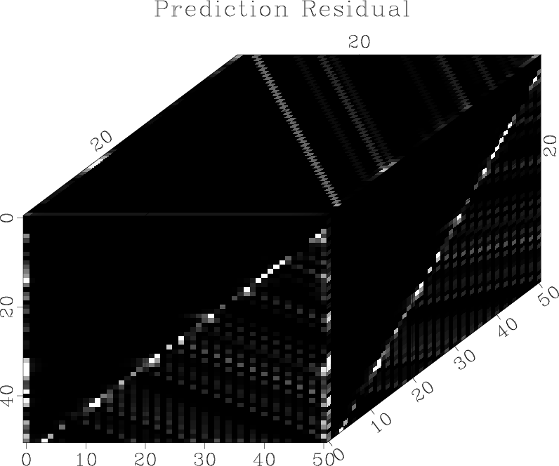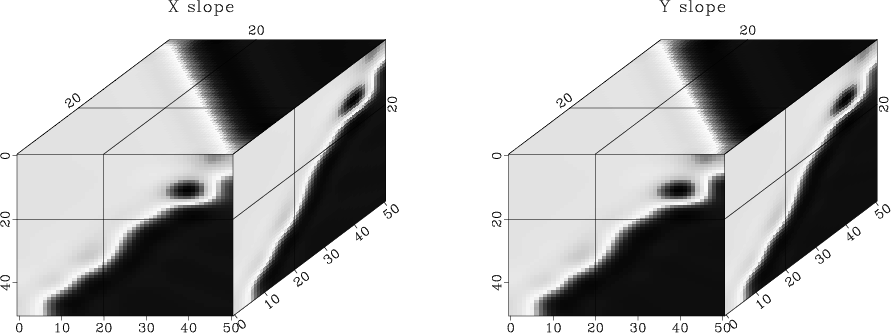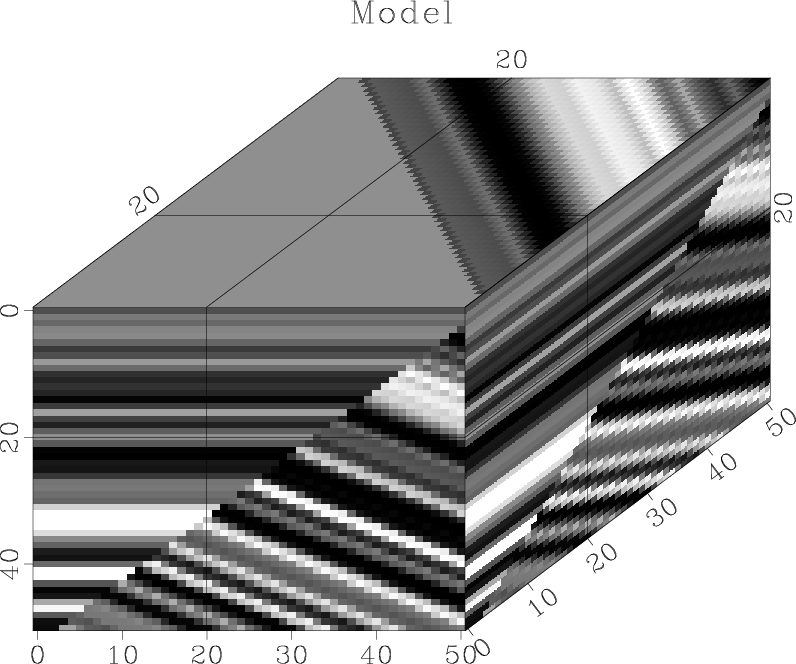 Figure 5 shows a simple synthetic model of two plane waves, separated by a plane fault. The slope estimates for the two orthogonal directions are shown in Figure 6. We can see that the estimation procedure correctly identified the regions of constant slope. Finally, estimating a local 3-D plane-wave predictor by spectral factorization and convolving the resultant non-stationary filter with the input model, we obtain the prediction residual, shown in Figure 7. In the residual, both plane waves are effectively destroyed, and we observe a sharp image of the fault plane. This result compares favorably with results of alternative methods, collected by (Schwab, 1998).