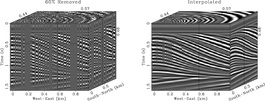 Figure 10. Left: ``qdome'' model with 75% of the randomly chosen traces removed. Right: result of missing data interpolation with a 3-D local plane-wave prediction filter. |