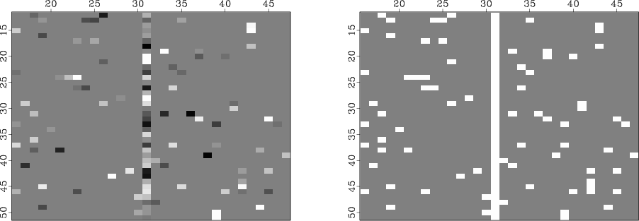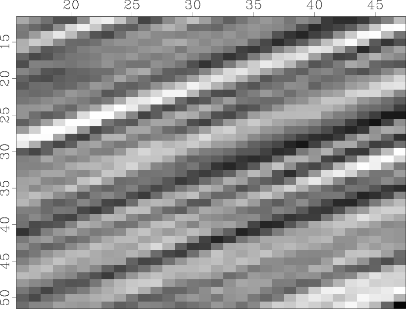 Claerbout (2000) proposes a test case for which the Gaussian curvature of the model vanishes. In this paper, we present an even simpler test case. Given a 2-D random field, we deconvolve with a known dip (or steering) (Clapp et al., 1997) filter to obtain a ``plane wave'' model, as shown in Figure 1. To simulate collected ``data'', we sampled the model of Figure 1 at about 60 points randomly, and about two-thirds of the way down one trace in the center. The results are shown in Figure 2.