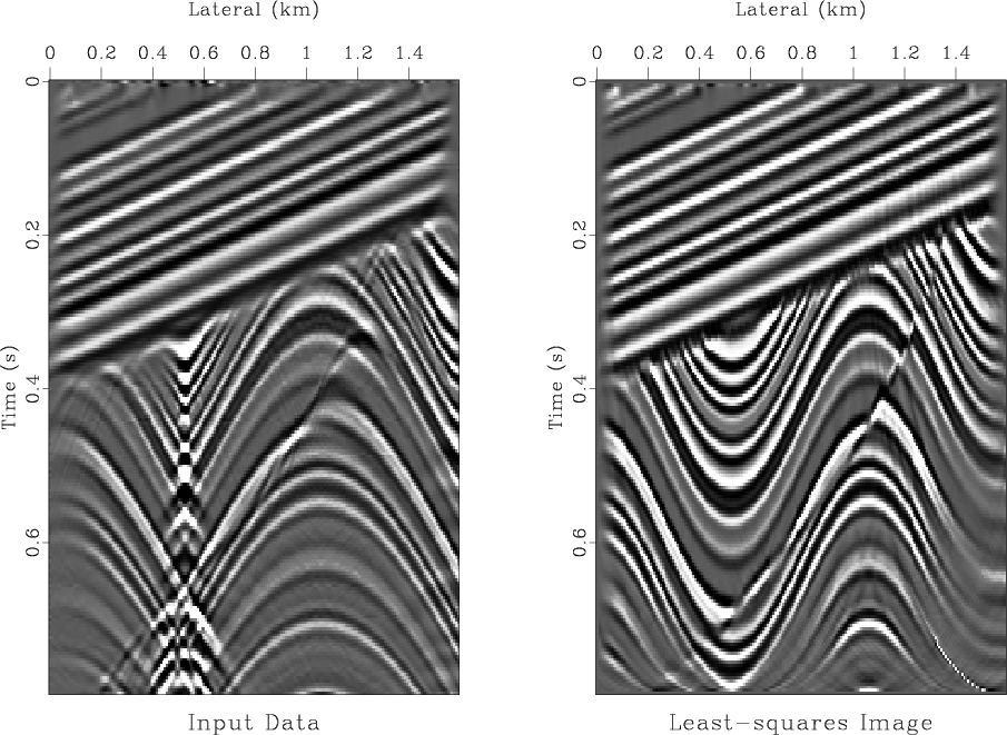 Figure 2. Input zero-offset section (left) and the corresponding least-squares image (right) after 10 iterations of iterative inversion. |