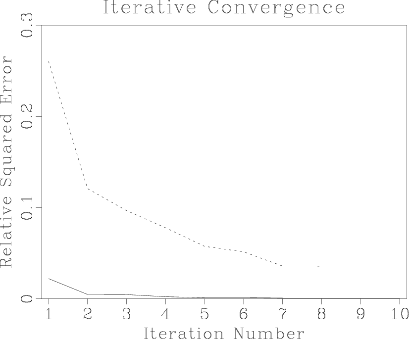 Figure 1. Comparison of convergence of the iterative least-squares migration. The dashed line corresponds to the unweighted (uniformly weighted) operator. The solid line corresponds to the asymptotic pseudo-unitary operator. The latter provides a noticeably faster convergence. |
