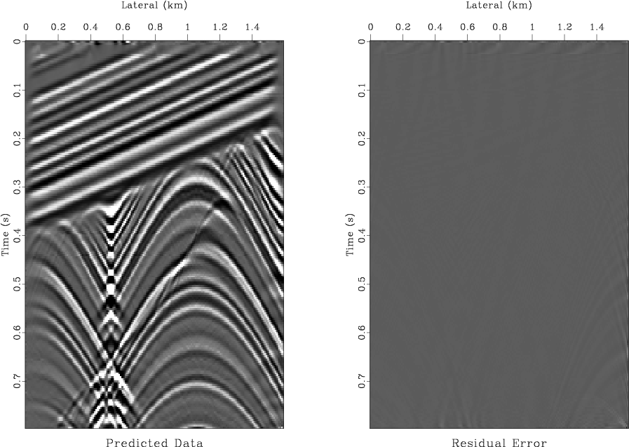 Figure 3. The modeled zero-offset (left) and the residual error (right) plotted at the same scale. |