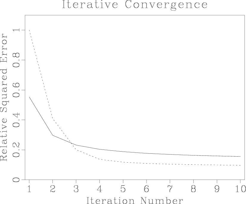 Figure 4. Comparison of convergence of the iterative velocity transform inversion. The dashed line corresponds to the unweighted (uniformly weighted) operator. The solid line corresponds to the asymptotic pseudo-unitary operator. The latter provides a faster convergence at early iterations. |