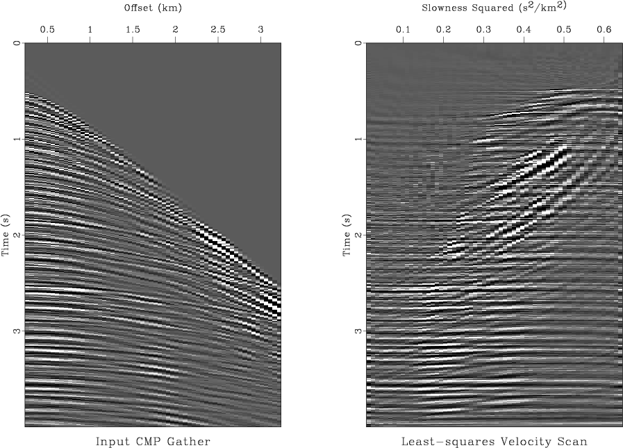 Figure 4 shows the output of a numerical test of the least-squares velocity transform inversion using a CMP gather from the Mobil AVO dataset (Lumley et al., 1995). The input CMP gather (shown in the left plot of Figure 5) is inverted using an iterative conjugate-gradient method and two different weighting scheme: the uniform weighting and the asymptotic pseudo-unitary weights (71-72). Analogously to Figure 1, the iterative convergence is measured by the least-squares norm of the data residual error at different iterations. Figure 4 shows that the pseudo-unitary weighting provides a noticeably faster convergence at the first three iterations. At later iterations, the residual errors of the two methods are very close to each other. The use of a pseudo-unitary weighting will be justified in this case if only three iterations are practically affordable. The results of inversion after 10 conjugate-gradient iterations are plotted in Figures 5 and 6. The right plot in Figure 5 shows the output of the velocity transform inversion: an optimized velocity scan. Figure 6 shows the corresponding modeled CMP gather and the residual error. The error is negligible which indicates a successful inversion.