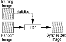 In terms of digital images, the word texture might be defined as, ``an attribute representing the spatial arrangement of gray levels of the pixels in a region,'' (IEEE, 1990). In the same context, I define texture synthesis as the process of first estimating the spatial statistical properties of a known image and then imparting these statistics onto a second (random) image. Figure 1 illustrates the general approach taken here: an uncorrelated image is transformed into one with the same statistical qualities as a known ``training image'' (TI), through an as-yet undefined filtering operation.