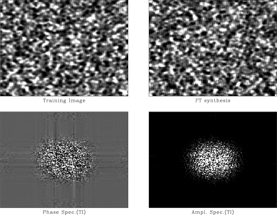 Figures 2 and 3 illustrate the Fourier transform method of texture synthesis. Clockwise from top-left: the training image, the synthesized image, the TI's amplitude spectrum, and the TI's phase spectrum.