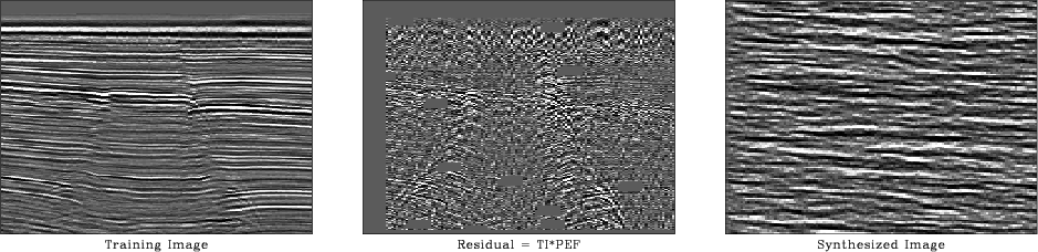 Figure 9 shows the result of applying PEF texture synthesis to a 2-D stacked seismic section. The residual panel is interesting; notice uncollapsed diffraction hyperbolas, two highlighted fault planes, and also statics-like artifacts in the earlier times. PEF's easily predict straight lines (plane waves) and sinusoids, but hyperbolas and discontinuities are quite another matter.