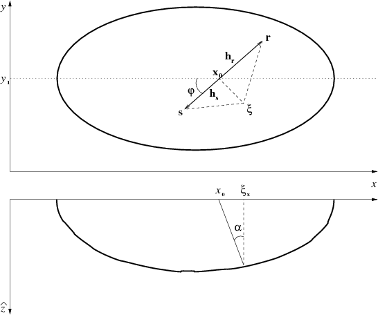 ellipsoid of a prestack migration impulse response (a scheme). Top: Map view.