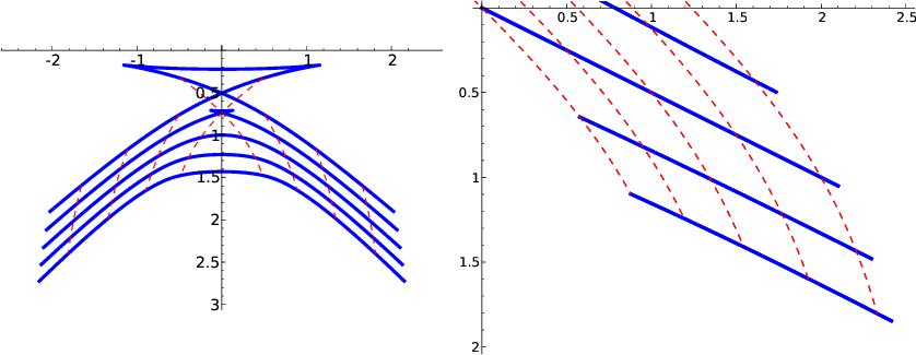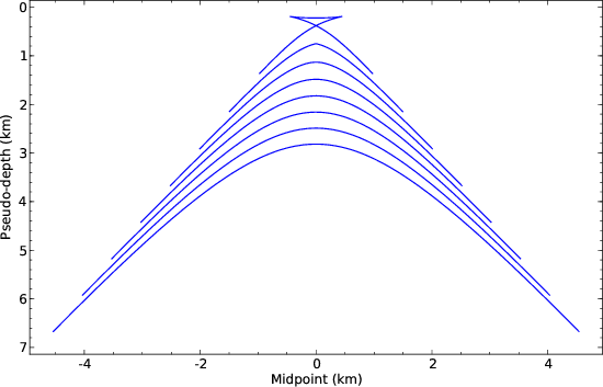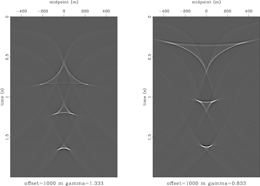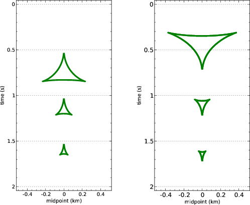 Figure 7 illustrates the residual NMO+DMO velocity continuation for two particularly interesting cases. The left plot shows the continuation for a point diffractor. One can see that when the velocity error is large, focusing of the velocity rays forms a distinctive loop on the zero-offset hyperbola. The right plot illustrates the case of a plane dipping reflector. The image of the reflector shifts both vertically and laterally with the change in NMO velocity.