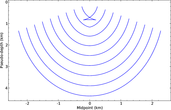 Figure 9. Summation paths of prestack residual migration for a series of depth diffractors. Residual slowness ![]() ![]() |