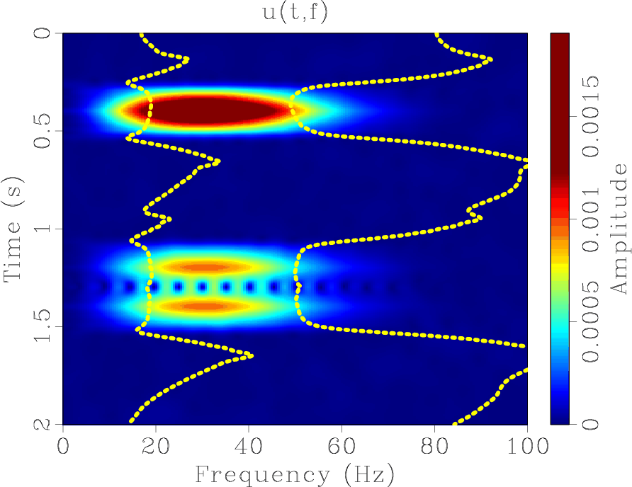 Figure 2. (a) Synthetic signal. (b) Local ![]() ![]() ![]() ![]() The dashed lines in (b) and (c) indicate the effective bandwidth (estimated using equation 11). |