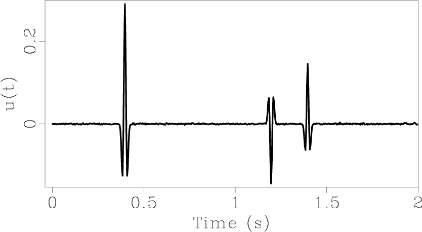 Figure 3. (a) Synthetic signal (sampling period is 4 ms). Arrivals are at 0.4, 1.2 and 1.4 s. (b) ![]() ![]() |