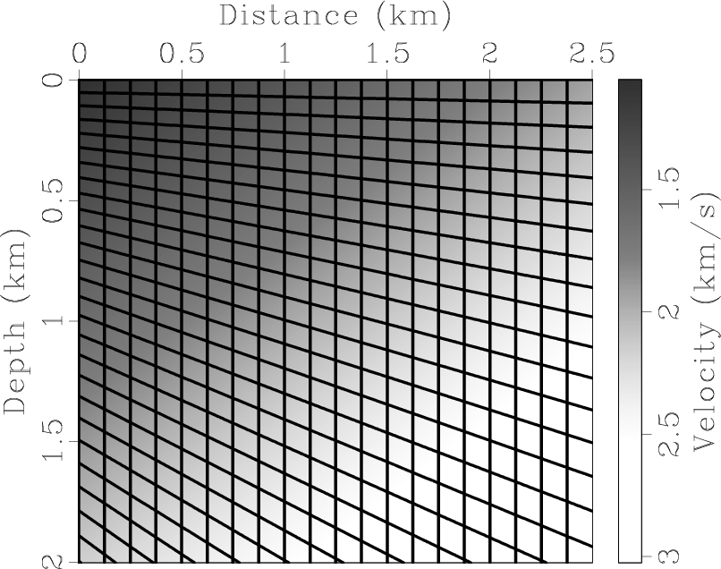 Figure 2. A linear velocity model in (a) Cartesian domain and (b) orthogonal ![]() ![]() ![]() |