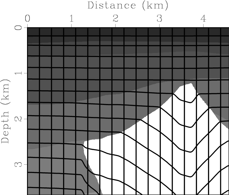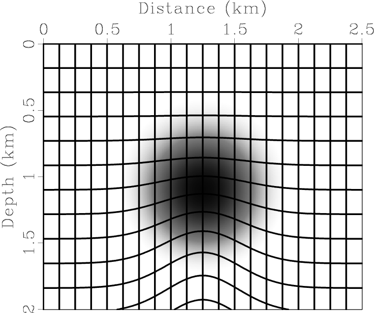 mesh is overlaid on the velocity model, a prominent ``pull-down'' near the bottom of the model is due to the slow velocity lens. By the same analogy, a ``push-up'' will appear in the
