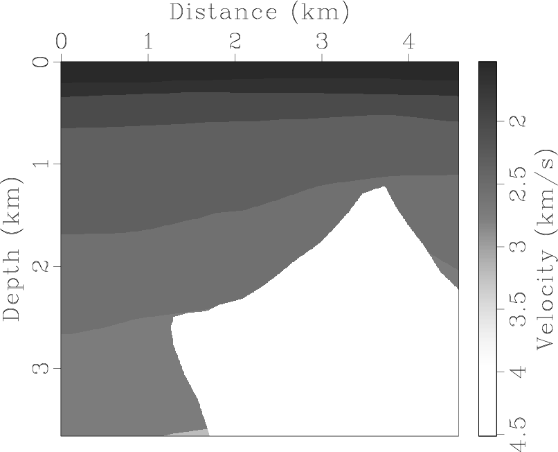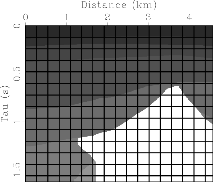 domain beneath a positive velocity anomaly, for example a salt body. By applying the change of variable in Equation 2, the velocity is interpolated to the