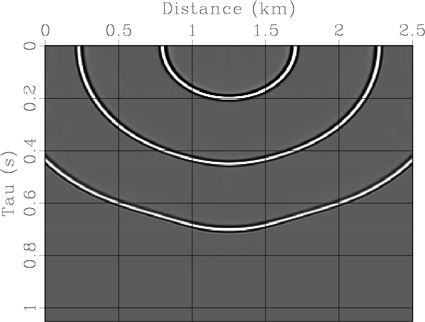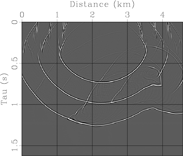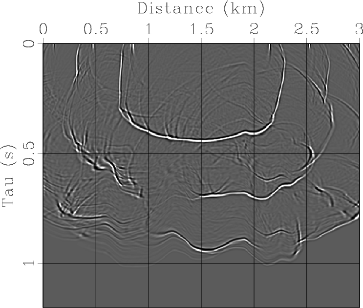 The zero-offset section in Figure 4 is migrated using Equation 10 by extrapolating backward in time and applying zero-time imaging condition. The resulting image is shown in Figure 5(c).