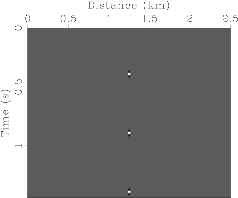 Figure 4. Zero-offset section with three impulse events equally spaced in time. The source has peak frequency of ![]() ![]() |