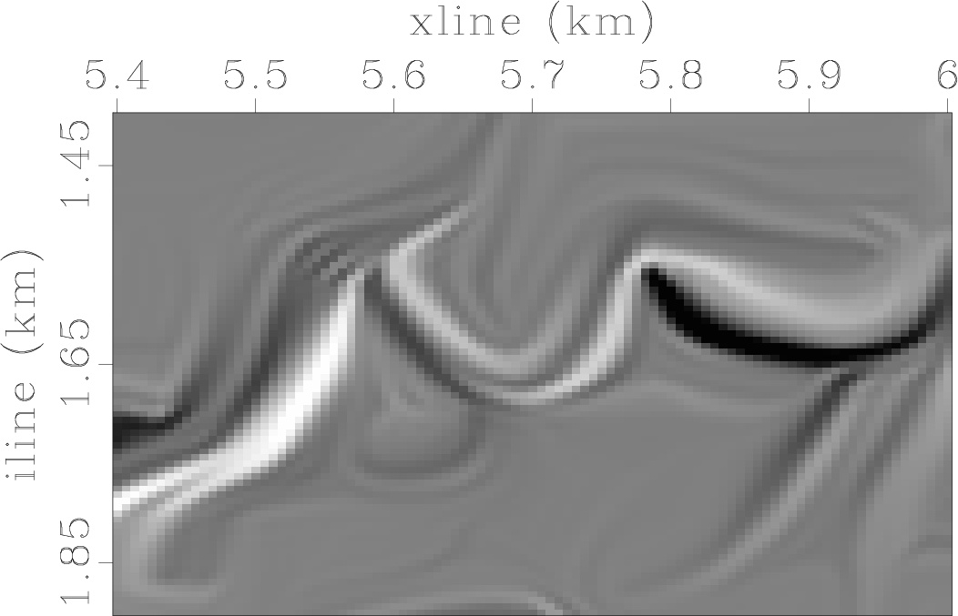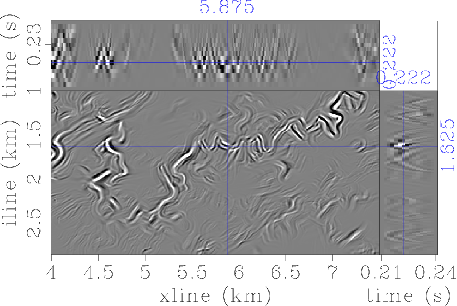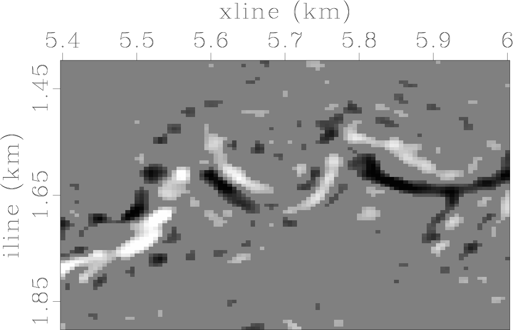 To account for amplitude differences and for higher continuity of denoised diffractions (Figure 10b) in comparison to the stack with AzPWD (Figure 10a) signal and noise orthogonolization (Chen and Fomel, 2015) has been applied. Similarity between restored signal (Figure 10b) and restored noise (Figure 10c) is measured. Then, signal energy, which leaked to the difference volume (Figure 10c) and which has high similarity with the signal events actually predicted (Figure 10b), is withdrawn from the noise volume and added to the signal estimate.
