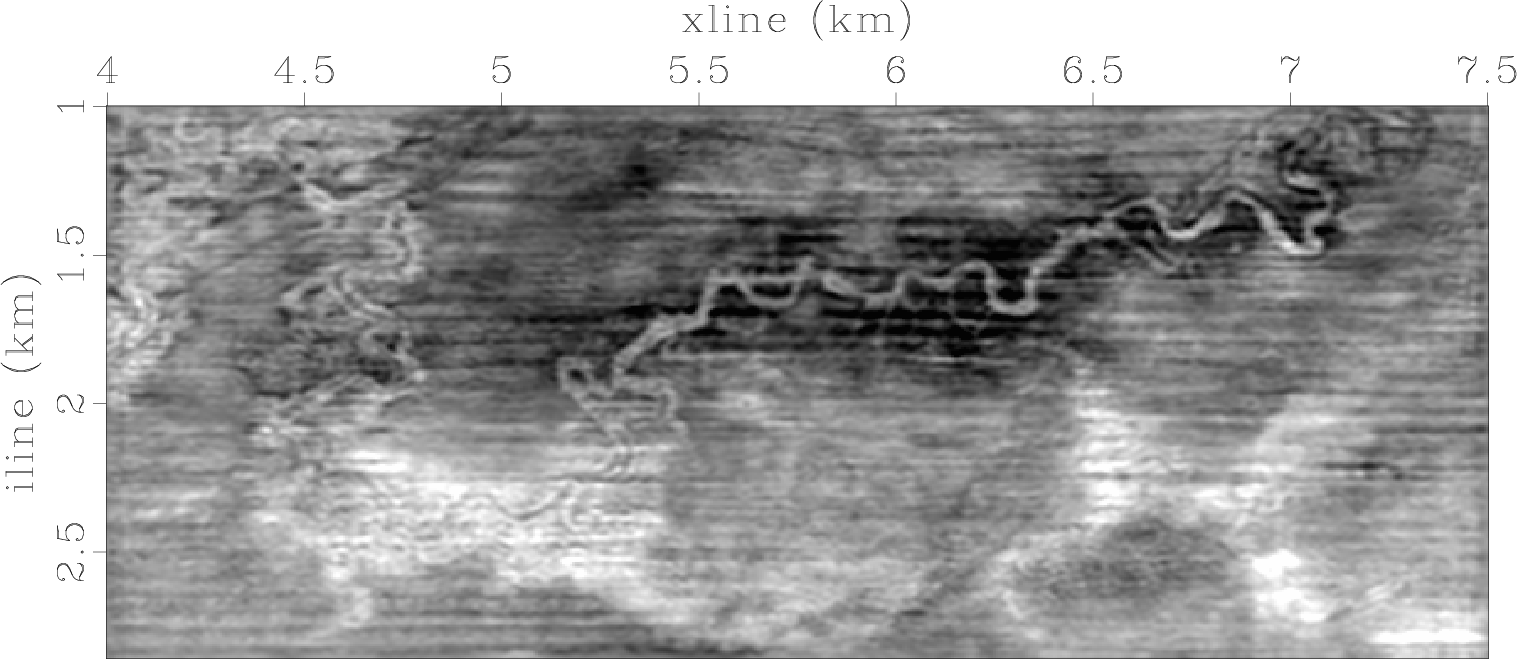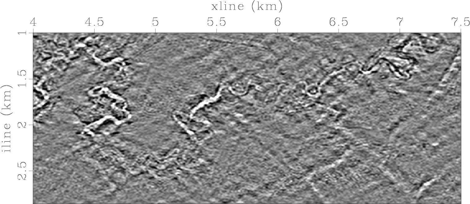 The post-stack 3D Kirchhoff time migration image of the target slice is shown in Figure 7a.