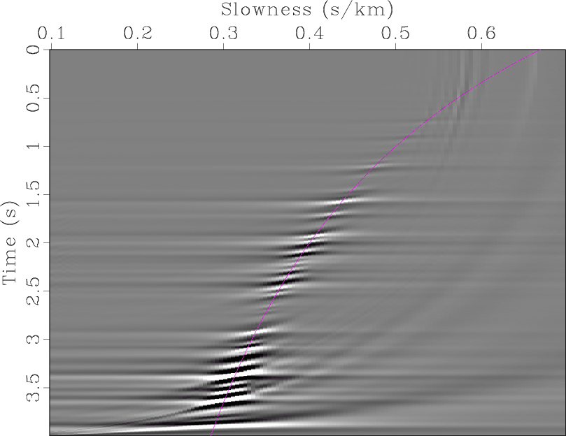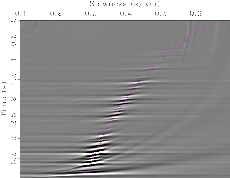 . Output of the velocity scan applied to the synthetic data in Figure 12. CPU time: 125.54 s. Purple curve overlaid is the true slowness.