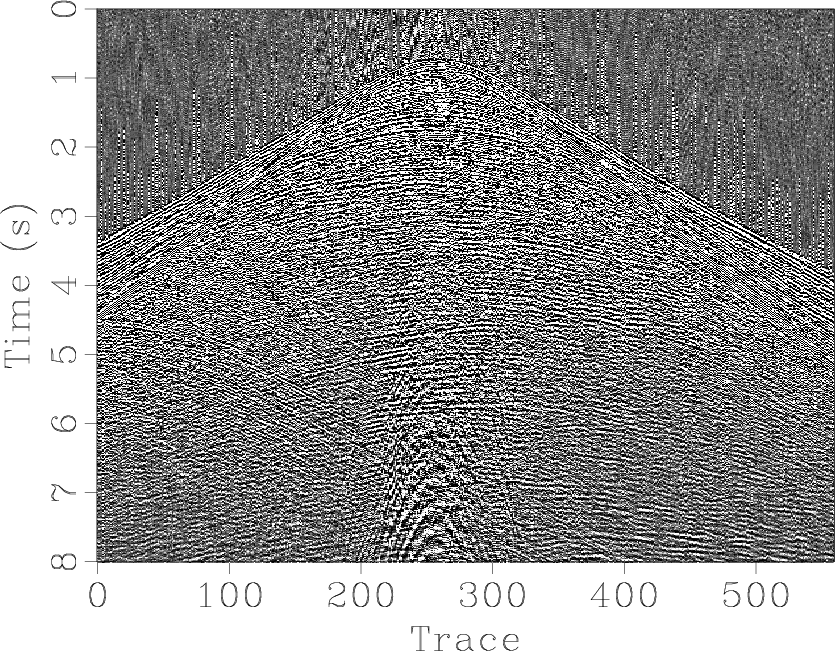 Finally, we use a field data example to further test the effectiveness for our proposed algorithm. The field data is similar in appearance to the previous synthetic example. Because of the previous test, we only used seislet-domain soft thresholding as the shaping operator.