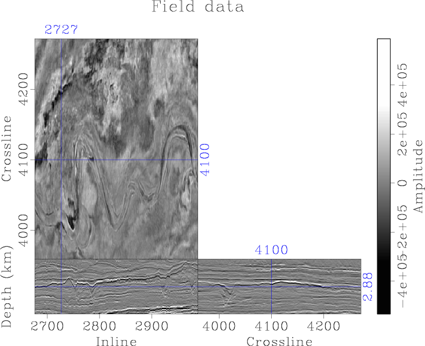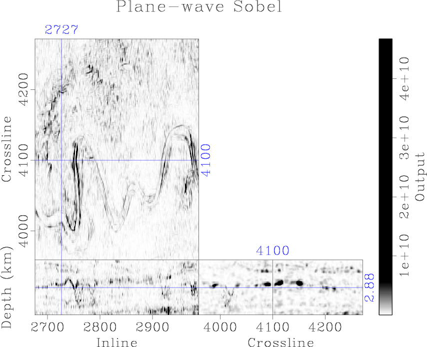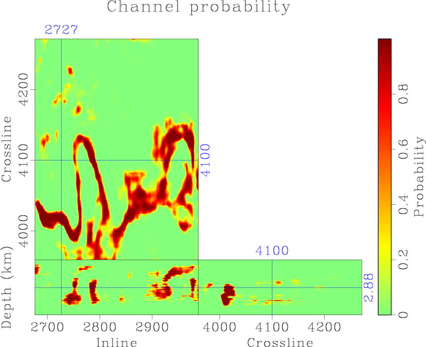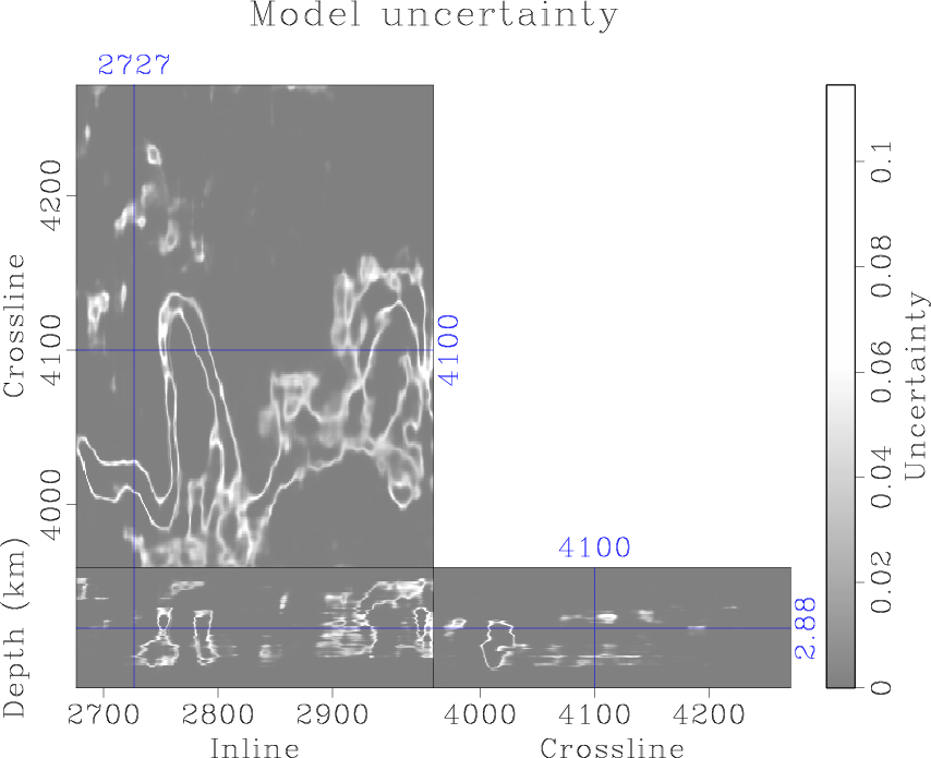When there are multiple channels in the dataset (around crossline 4000 and inline 2780 in Figure 11), the trained model cannot distinguish individual channels very well and the prediction uncertainty is high. The trained model can detect thin channels in the dataset with not too high probabilities, but the uncertainty map displays high values in these regions. Therefore, the prediction uncertainty has useful information for the channels detection task and interpreters can repick the regions with high uncertainty to enhance the detection result from neural network. Our result follows the channel edges enhanced by plane wave destruction Sobel filter (Phillips and Fomel, 2017) (Figure 12b), with the addition of model uncertainty.