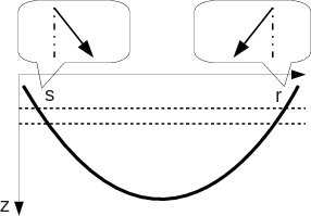 Figure 1. A diving ray and zoom-in of the ray segments between two depth levels. |