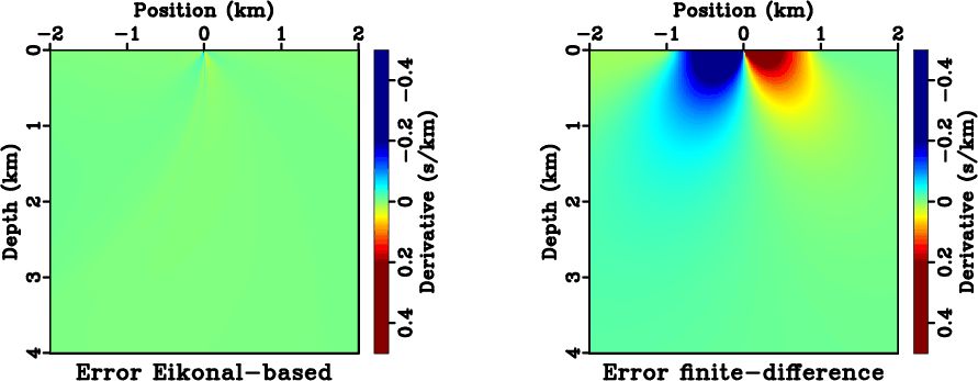 Figure 2. Comparison of error in computed source-derivative by (left) the proposed method and (right) a centered second-order finite-difference estimation based on traveltime tables. The maximum absolute errors are ![]() ![]() |