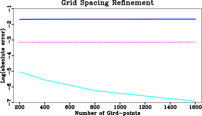 Figure 5. Gird-spacing refinement experiment. The plot shows, at a fixed source sampling of ![]() |