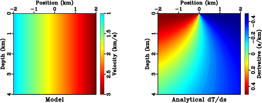 lateral position and z is the depth, the traveltimes and source-derivatives have analytical