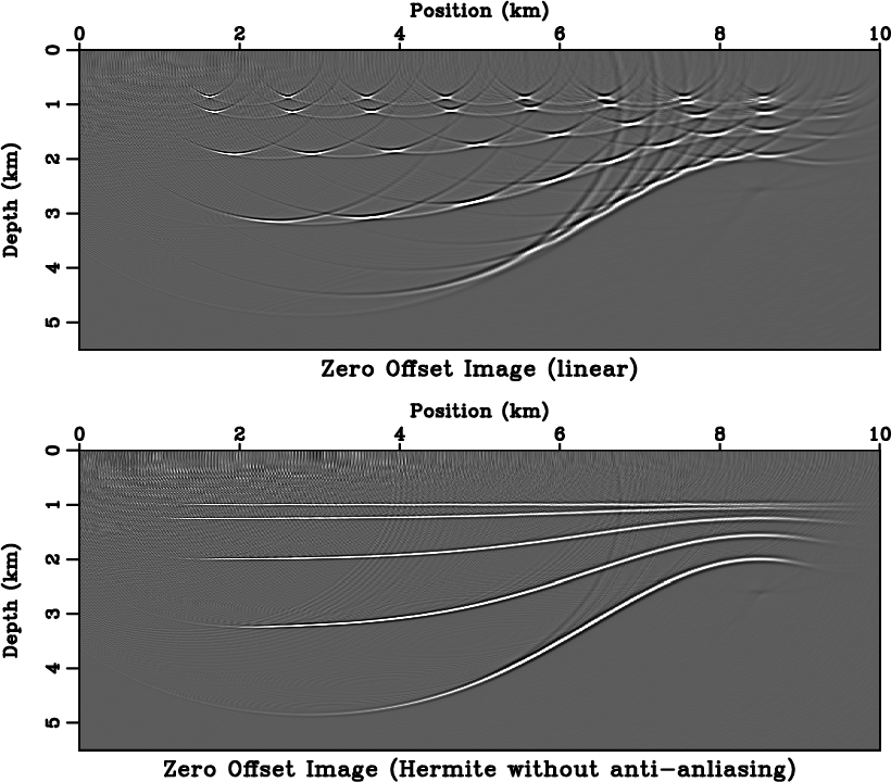 Figure 8. Zero-offset Kirchhoff migration image with (top) the linear interpolation and (bottom) the cubic Hermite interpolation without anti-aliasing. |