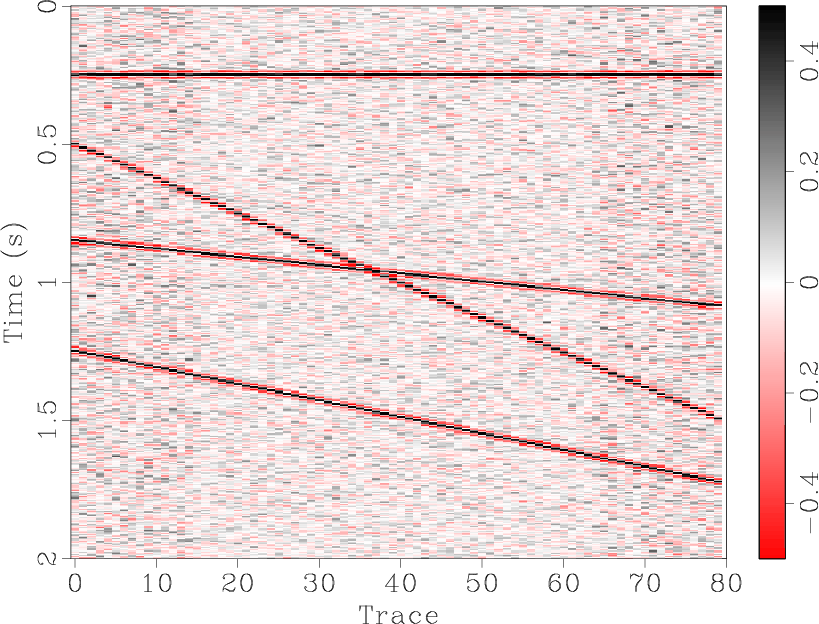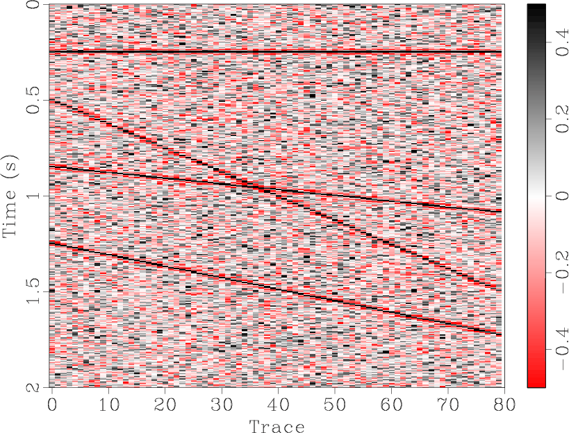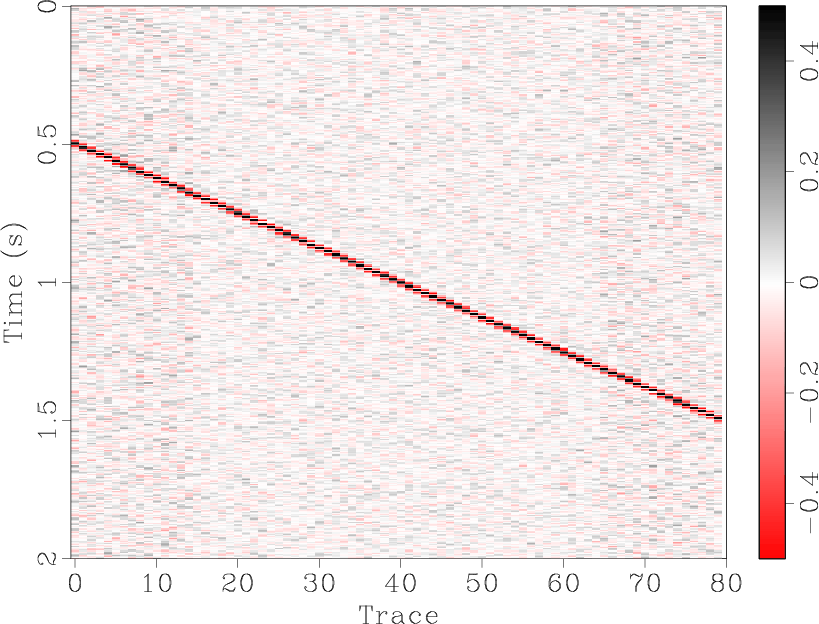 The synthetic data shown in Figures 1(a), 1(d), and 1(j) were all generated by SeismicLab (Sacchi, 2008), with a signal-to-noise ratio (SNR) of 2.0 for all of them. Here we define the SNR as the ratio of maximum amplitude of useful energy and the maximum amplitude of Gaussian white noise. Note that the same parameters were used for the predictive filters in each case shown in Figure 1.