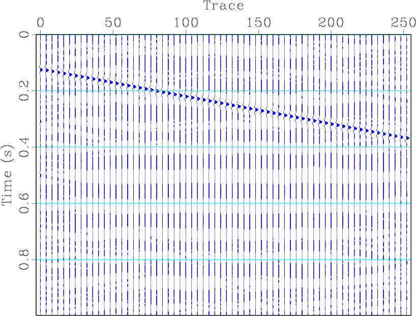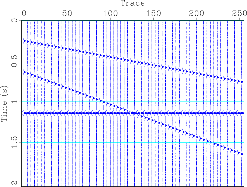 Figure 3 demonstrates how an EMD based dip filter works on a synthetic plane-wave seismic profile containing three events corresponding to three dips. After filtering with high-pass, mid-pass, and low-pass dip filters, respectively, the three plane waves are successfully separated . The parameters we choose in designing these three filters are shown in Table 1.